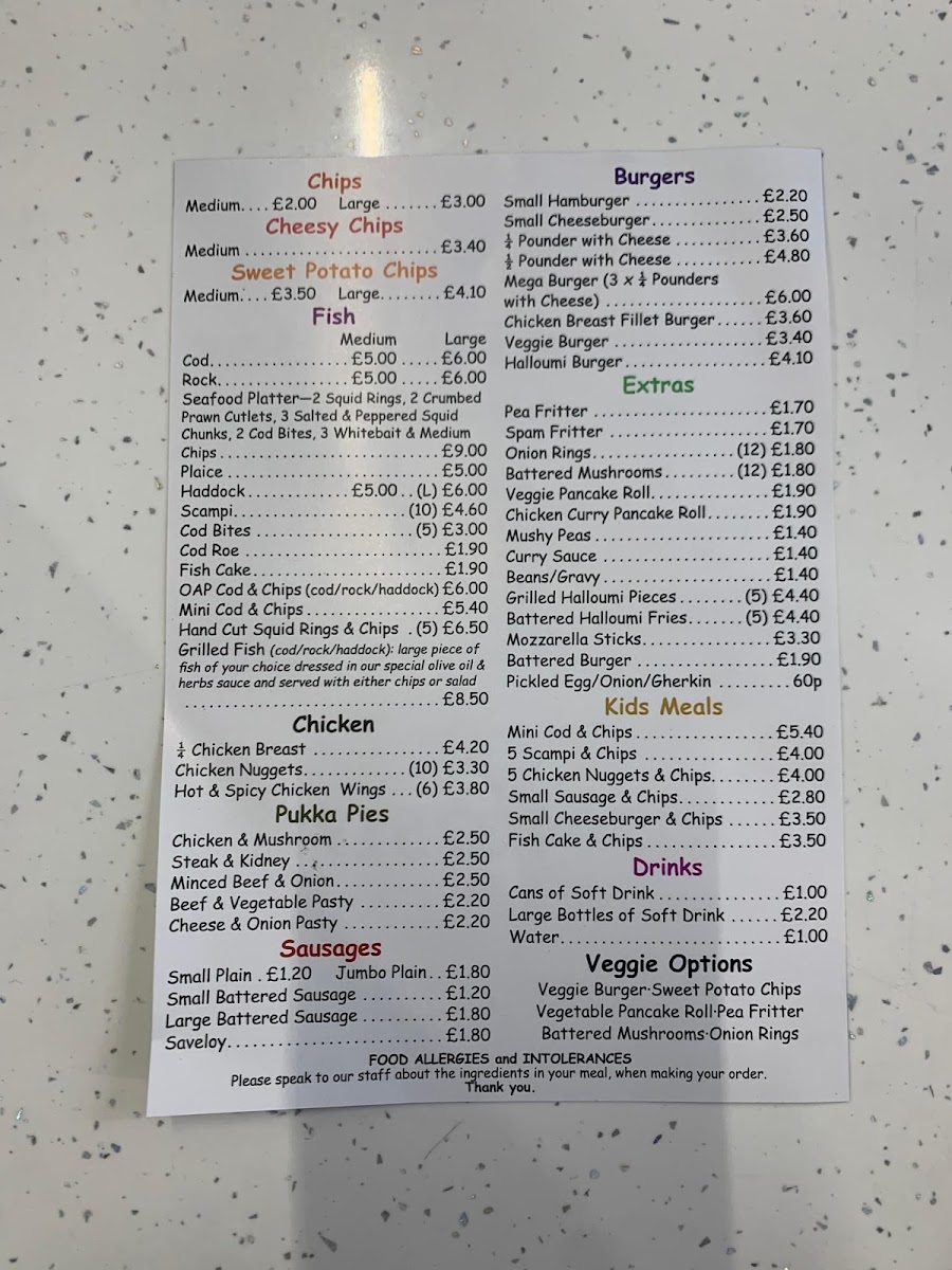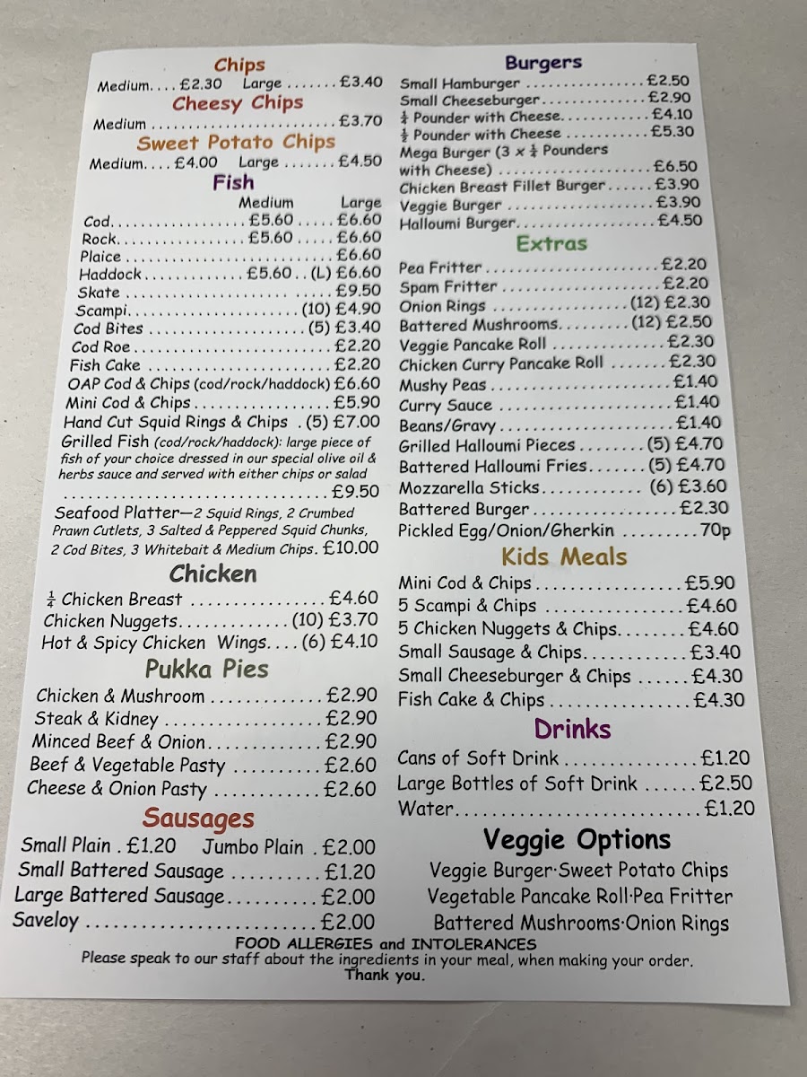Welcome to Ossies Fish Bar, a hidden gem located at 177a Telegraph Rd, Deal, CT14 9DR. This local chippie is celebrated for its fresh, expertly cooked dishes that promise great value for money. The menu boasts a mouthwatering selection, showcasing succulent fish and chips, with large cod portions that have won rave reviews, priced around £9.